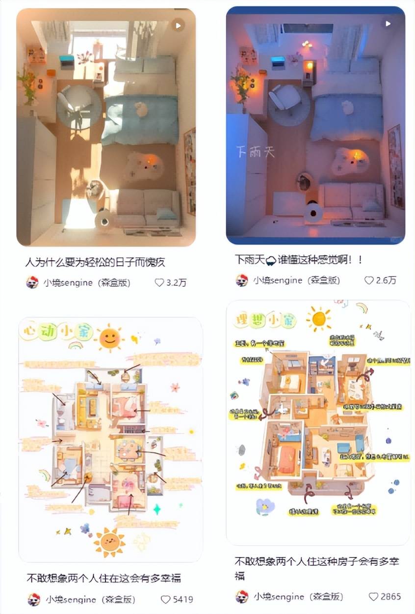 但我们还是想做点不一样的。于是我们采取了一个玩家共创的思路。我让我们的新媒体团队发了大量的内容来做测试,比如手绘户型图、各种风格房间等等。