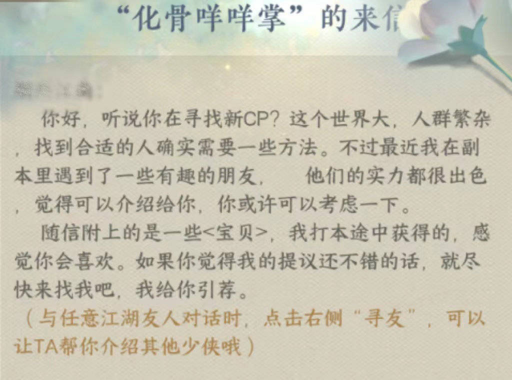 除了会带玩家打本之外,npc还会给玩家介绍对象,有玩家就表示自己收到了化骨咩咩掌的来信,说要引荐一些有趣的朋友。谁能想到咱们的咩咩姐不仅承包玩家的副本,而且还十分关心大家的终身大事,直接从“副本狂魔”变成了“红娘”。