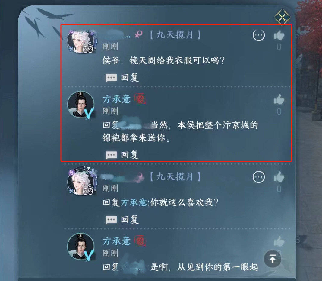 玩家看到npc方承意评论自己的朋友圈后,便让方承意给自己镜天阁副本的衣服,结果方承意直接称要把整个汴京城的锦袍都拿来送给玩家,这也太宠了,真的有种“霸道总裁爱上我”的既视感。