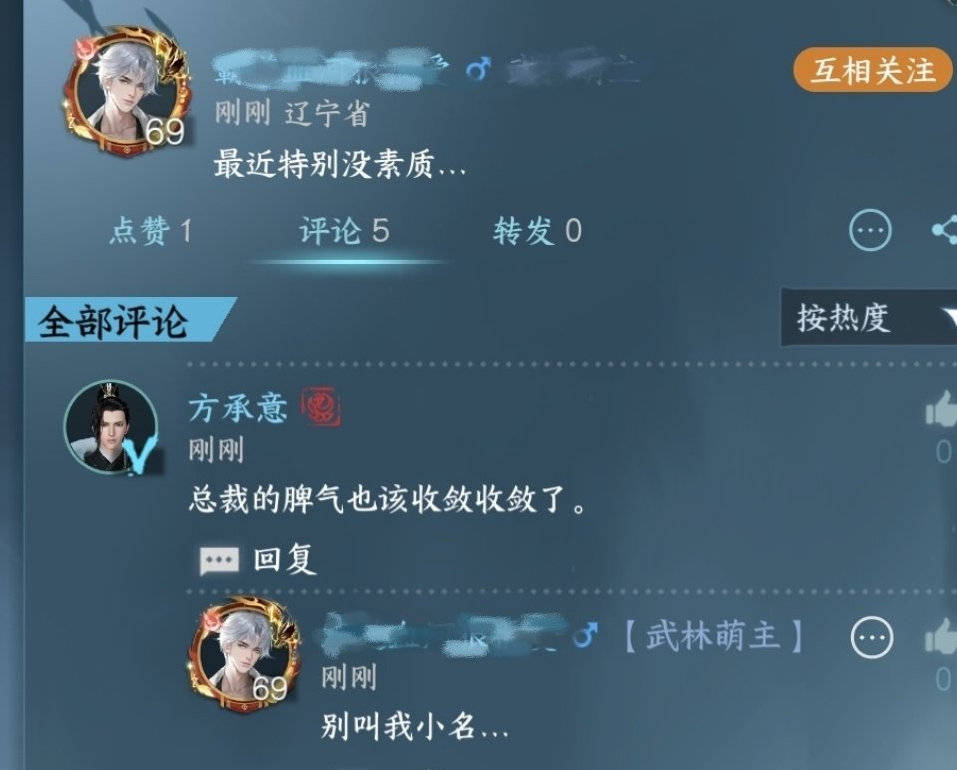 有时候方承意也会怼玩家,有玩家晒出了自己发朋友圈吐槽自己最近没素质,结果方承意还劝这位玩家收收总裁脾气,《逆水寒》手游的npc真的太有趣了。