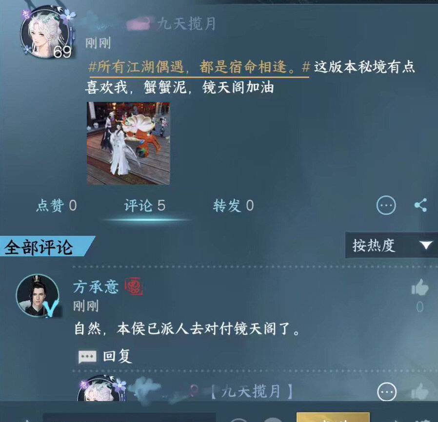 不仅如此,《逆水寒》手游中的npc还会发朋友圈动态,甚至还会和玩家互动。有玩家在游戏里发了朋友圈之后,npc方承意便评论了玩家的朋友圈,还表示已经派人去对付镜天阁了。