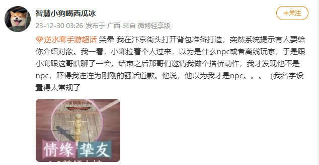 还有玩家称自己把npc介绍的对象当成了真人玩家,然后闹出了乌龙笑话。这位玩家称自己在汴京准备打造的时候,恰好npc小寒要给自己介绍对象,随后就看到小寒拉着一个人向自己走来。