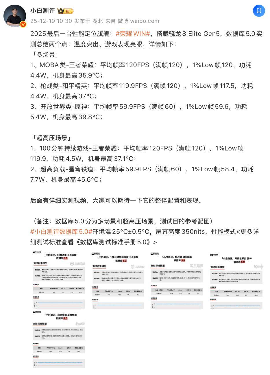 小白测评、极客湾Geekerwan、新评科技、WHYLAB、请不要叫我测评君五大头部科技博主同时发布荣耀WIN的性能测试数据,实测数据结果全面领先。这也让不少网友感到惊喜,主打电竞手机果然不同寻常,荣耀这次在电竞领域的投入确实够有诚意。