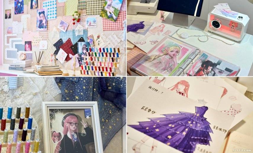 游戏里的“灵感空间”被整个搬进展厅,成为一个充满生活气息的服装工作室。墙边放着试衣镜和两套熟悉的套装,墙上琳琅满目的布料、制衣工具与照片,桌上摊开着设计手稿与几十个色号的缝纫线,缝纫机静立一旁,音箱里还有小暖暖在哼唱旋律,而真正的暖暖,仿佛就只是暂时离开了一会儿,随时会回到这里继续创作。