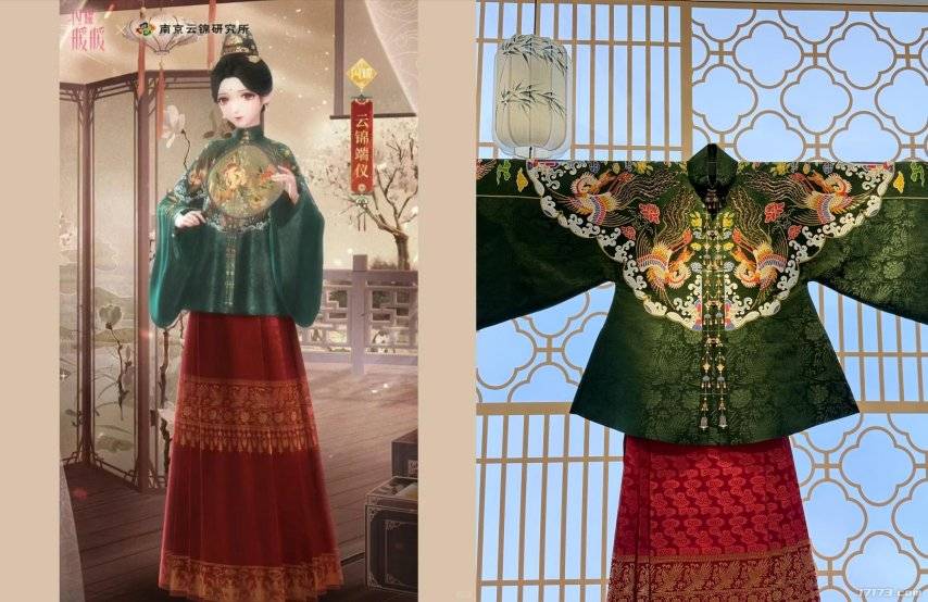 一件是与南京云锦研究所合作织造的“云锦端仪”,听说价值超百万。以往这样的织物总是隔着玻璃陈列,但这一次,它近在咫尺。你可以贴近到毫米的距离,去看那深浅晕染的丝线与细密铺陈的片金,和游戏里初见时一样震撼,甚至更甚。
