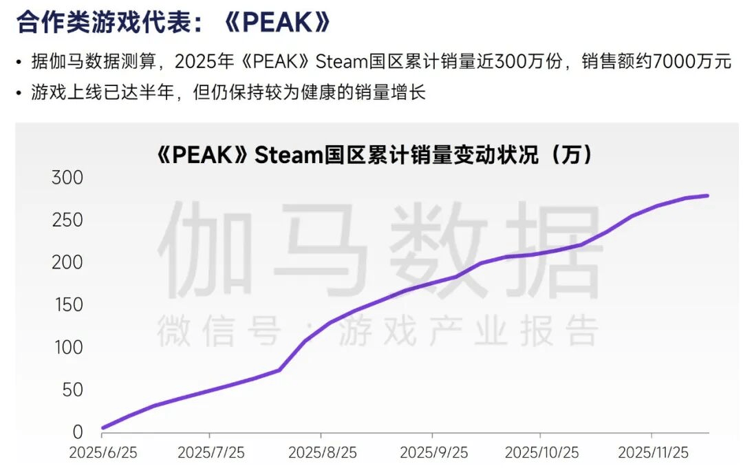 • 合作类游戏,代表产品《Peak》《R.E.P.O》的国内销量均达百万套级别,这类游戏通过“共赢才算赢”的核心构造,引导用户相互帮扶、减少彼此竞争及游戏失败后的相互指责,进而带来温暖、被陪伴的感受。值得注意的是,这一方向的高热度产品大多集中于PC平台,中国用户更习惯使用的手机平台少有游戏产出,目前市场仍存缺口。