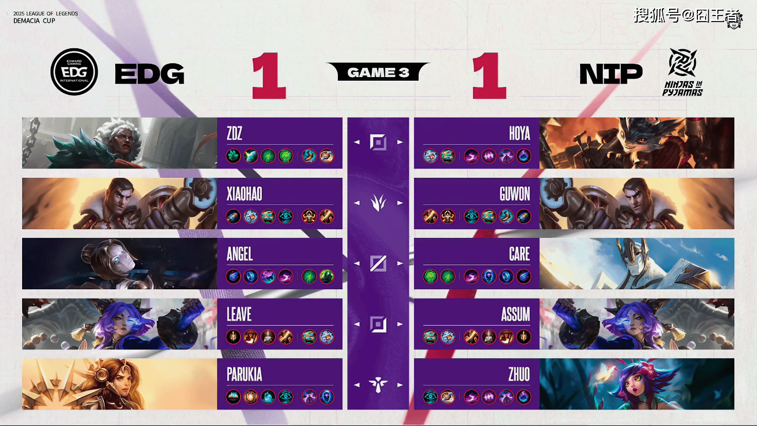 第三局比赛,EDG蓝色方,选用:Zdz安蓓萨、Xiaohao杰斯、Angel发条、Leave芸阿娜、Parukia蕾欧娜;NIP红色方,选用:HOYA兰博、Guwon杰斯、Care加里奥、Assum芸阿娜、Zhuo妮蔻