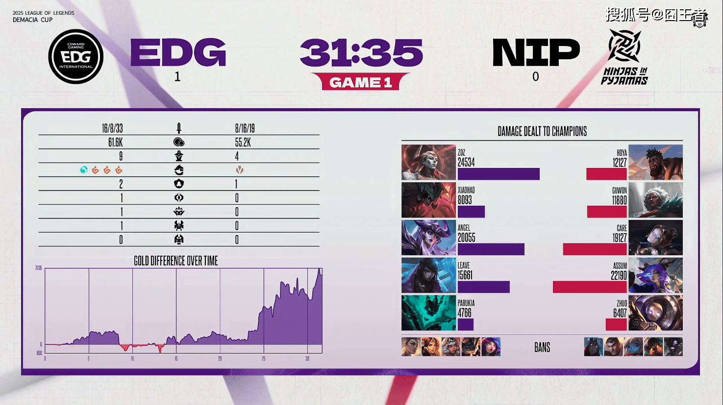 第一局比赛,EDG蓝色方,禁用:妮蔻、兰博、奇亚娜、蕾欧娜、芮尔,选用:Zdz亚恒、Xiaohao剑魔、Angel辛德拉、Leave厄斐琉斯、Parukia锤石;NIP红色方,禁用:韦鲁斯、杰斯、波比、泰坦、牛头,选用:HOYA奎桑提、Guwon安蓓萨、Care发条、Assum芸阿娜、Zhuo机器人