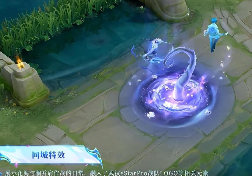 而在其中官方也加入了大量职业选手“花海”的元素,其中手持的双刃为E星的蓝色,而澜就身处在一片花海之中,看起来宛如一个洒脱飘逸的侠客。