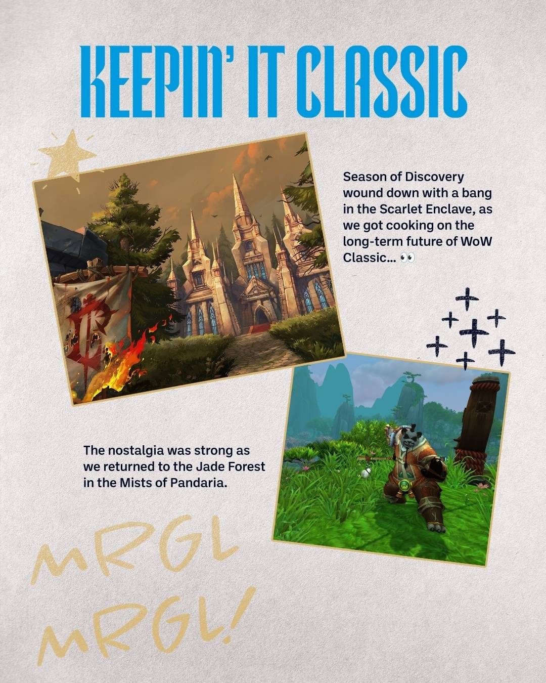 年底,暴雪发表2025年年鉴,总结2025年游戏内容,分享有趣数据。其中在探索赛季服,也就是Plus服的部分,写到“我们正在着手规划《魔兽世界》经典版的长期未来……”(we got cooking on the long-term future of WoW Classic... "),图片的右侧画着几个加号。由于Plus服已停更,这也被认为是暴雪正在开发新的经典+内容,也就是Plus2.0的暗示,如果一切顺利,可能明年的暴雪嘉年华就会官宣。