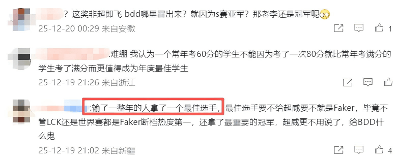 唯一让人迷惑的还是评奖标准的“灵活变通”,一会儿给超威最佳中单,一会儿给BDD年度选手,却只给Faker一个体育精神奖,确实有点耐人寻味。
