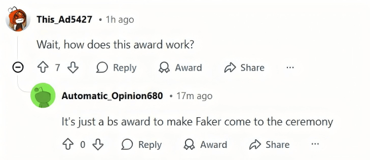 一些暴躁老哥甚至直接开喷组委会,请Faker过来蹭流量,却连一个年度最佳都不愿意给,这太扯淡了。