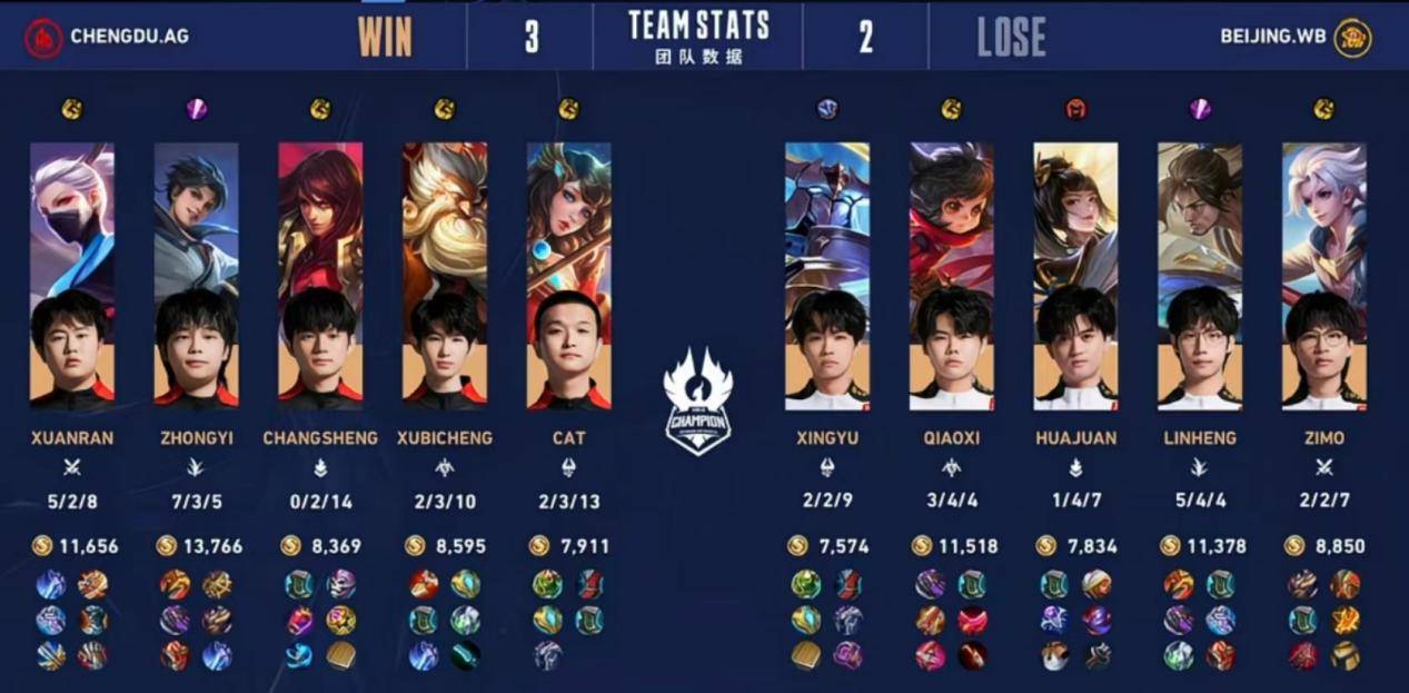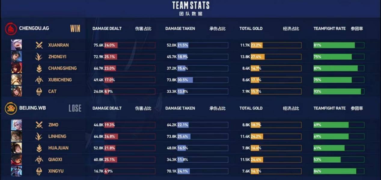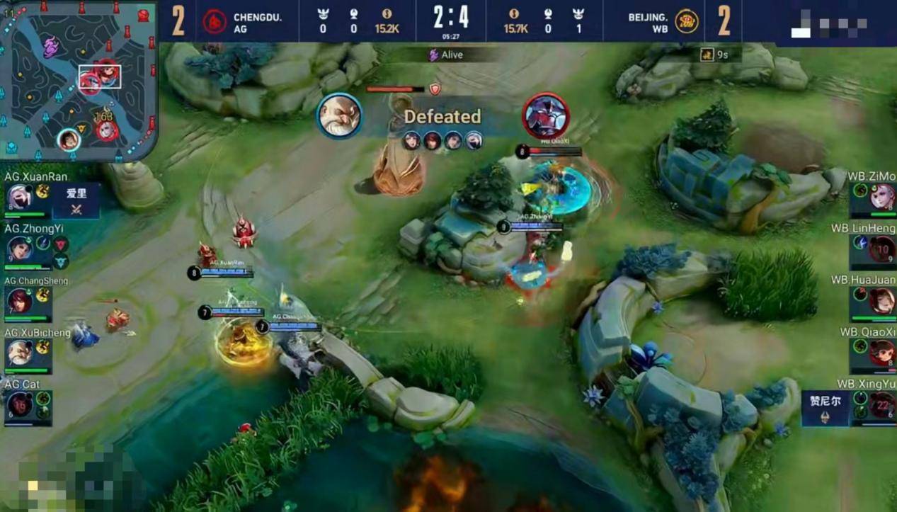 到了中后期,一诺的团战思路更加清晰,由于自己玩的是个战士,而且整体体系以保护大乔为主,所以在争夺资源是,一诺多次捆住关健人物进行开团,最终也是依靠“强悍的肉身”抵挡住WB众人一波又一波的进攻,带领AG拿下第五局比赛,作为一个射手位选手,能把战士打成这样Caryy确实当之无愧。