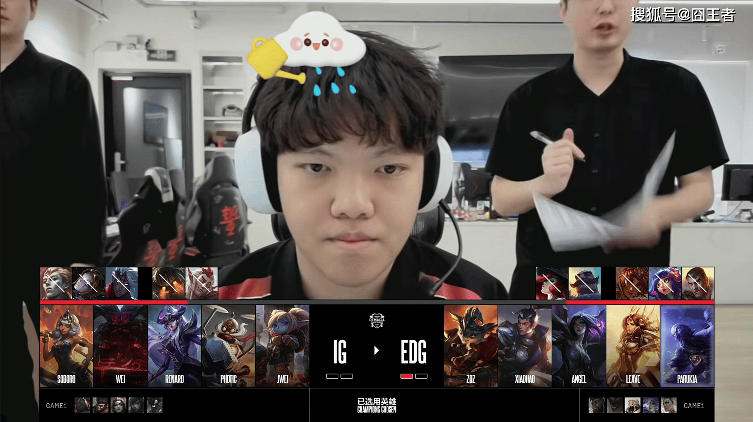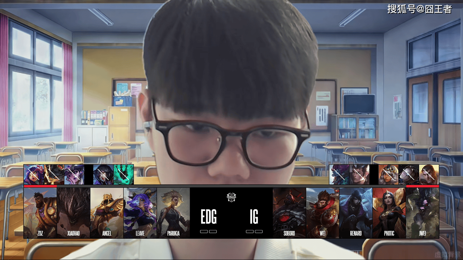第一局比赛,EDG蓝色方,禁用:妮蔻;兰博;辛德拉;阿狸;锤石,选用:Zdz奎桑提;Xiaohao石头人;Angel沙皇;Leave芸阿娜;Parukia芮尔;IG红色方,禁用:杰斯;发条;奇亚娜;赵信;巨魔,选用:Soboro塞恩;Wei猴子;Renard妖姬;Photic厄斐琉斯;Jwei牛头