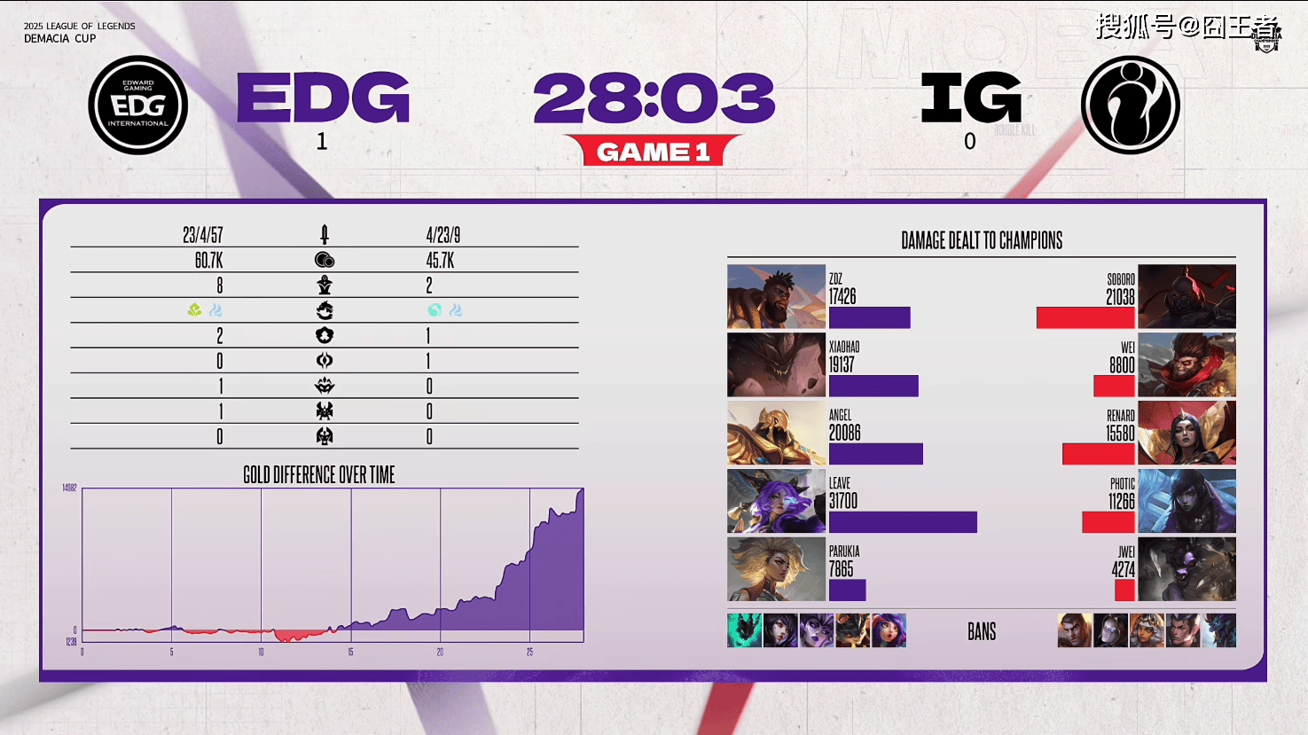 结果这一局比赛,EDG打出了单方面的碾压局。前15分钟,双方打得比较平稳,经济没有拉开。17分钟左右,EDG众人击杀Photic并推掉中路一塔;21分钟左右,EDG众人团战操作更优,打赢团战并拿下厄塔汗;22分钟左右,EDG团战再次碾压轻松取胜;最终28分03秒,EDG团灭IG,先赢一局!