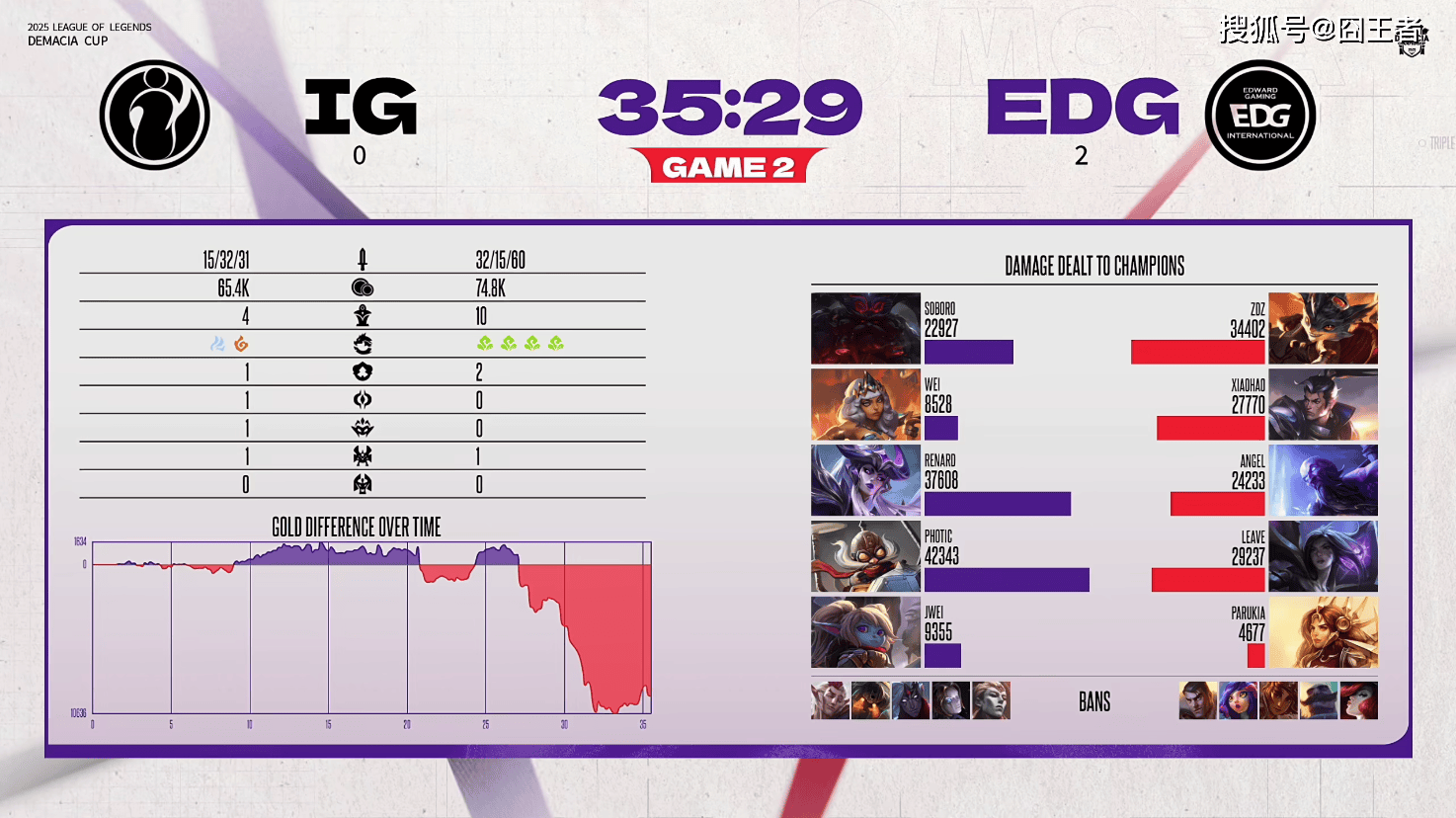 结果第二局比赛,两队各打了半场好局,EDG笑到最后。前15分钟,IG占据优势,但是17分钟左右,EDG打赢团战并拿下小龙;21分钟左右,Zdz兰博完美大招分割阵型,EDG打出1换3团战;24分钟左右,EDG率先拿下小龙,但随后Angel被秒EDG团战溃败;27分钟左右,Angel闪现进场拿下双杀,EDG拿下大龙;最终35分29秒,EDG团灭IG,拿下胜利。