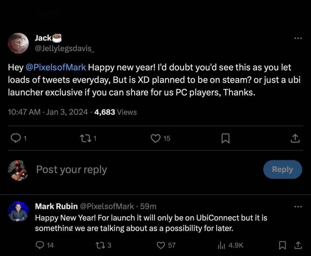 粉丝在X上向Mark Rubin询问《不羁联盟》是否会登陆Steam,Mark Rubin回应表示:《不羁联盟》首发只会登陆Ubisoft Connect,登陆Steam的可能性将在之后进行讨论。