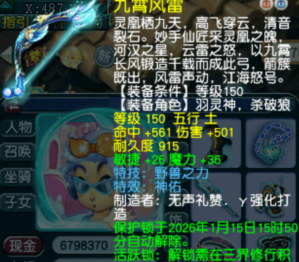 最近,一位少侠在鉴定150级武器时,意外触发了“逆天双蓝字”成就。这把弓箭拥有501点纯伤和敏魔双加62的属性,并附带神佑与野兽两个蓝字。