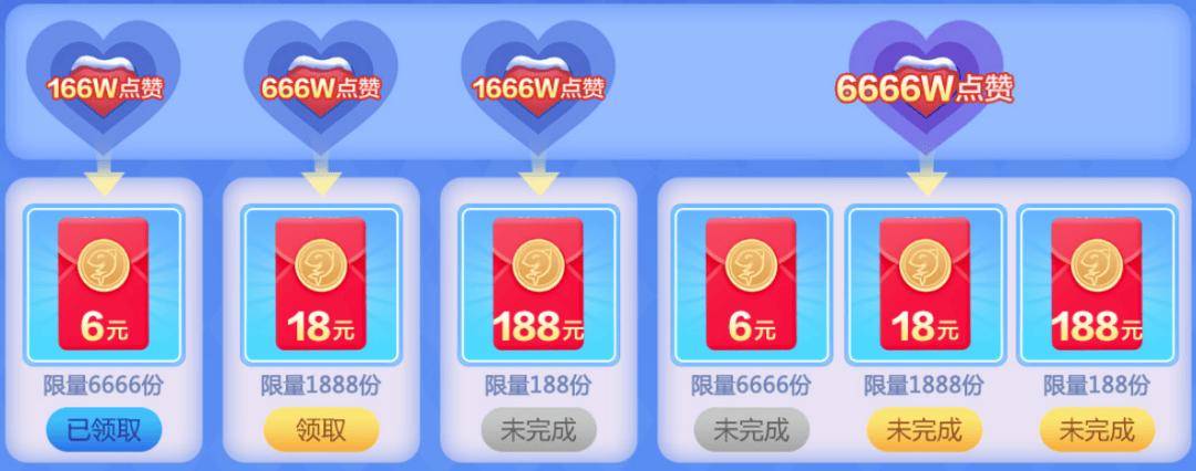 累计点赞达到6666万之后,解锁额外福利红包6元、8元、188元!