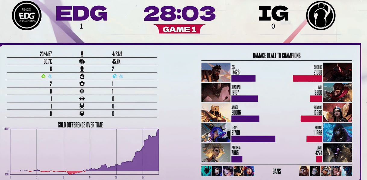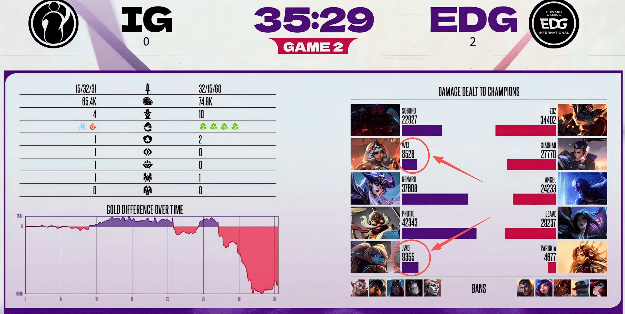 更为离谱的是,根据赛后的伤害统计来看,Wei作为野核的琪亚娜输出是8528,别说是远低于对位的EDG打野赵信了,就连自家辅助波比打出的9355伤害都不如,仅比对面辅助曙光女神高一些。