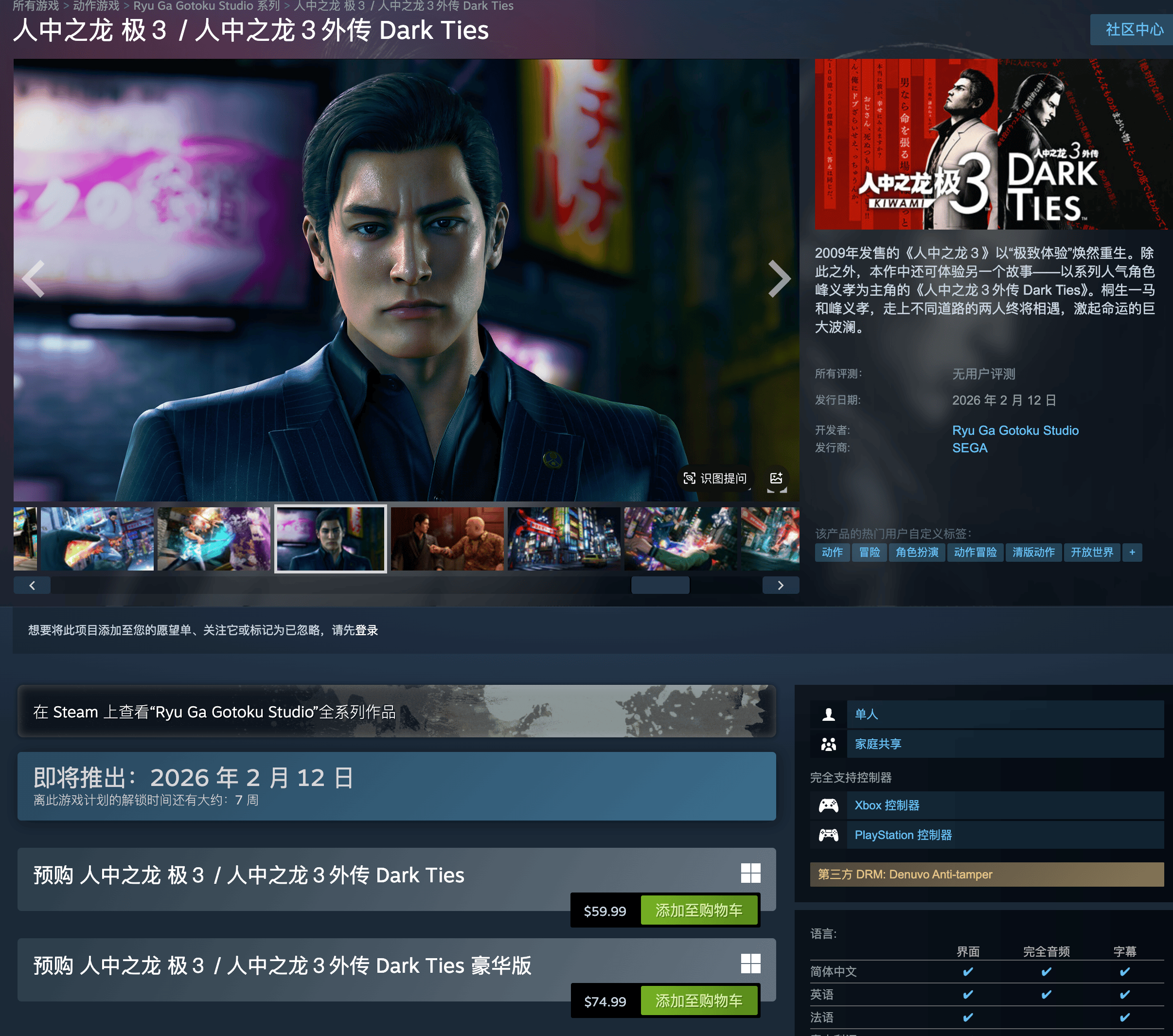 目前《如龙极3 / 3外传》已经定档2026年2月12日,全平台都能玩,预约通道也开了。给新老玩家提个小建议:现在先冲《如龙0 导剪版》,等《极1》《极2》中文更新后补完剧情,刚好能无缝衔接极3的琉球之旅。现在就去各大平台给极3加愿望单,还能第一时间收到发售提醒,错过福利就亏大了。