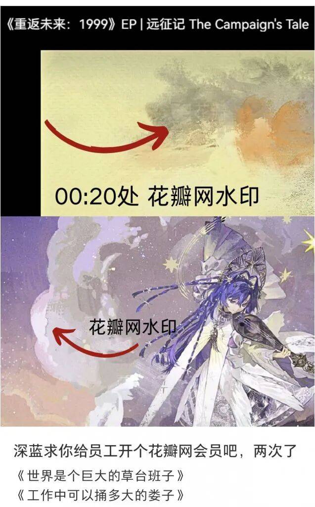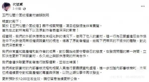 除了这类素材事故以外,当然还有版权事故,比如《代号鸢》复制粘贴没擦微博水印被玩家发现导致炎上,官方滑跪道歉。