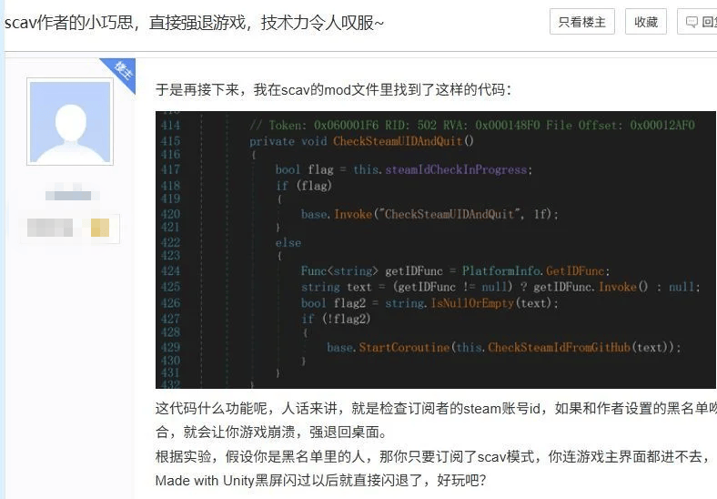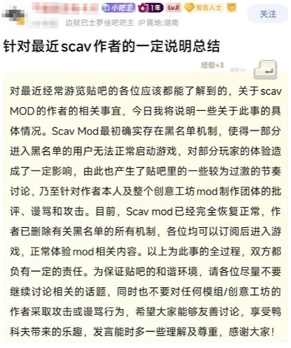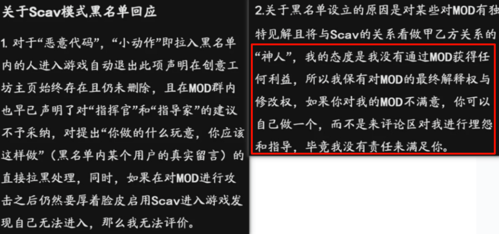 也正因为如此,官方对此事的裁断更倾向于和稀泥,主张双方都有过激和做得不对的地方,不如各退一步就此揭过。他们直接联系到了MOD作者,并在沟通后劝说其删除了“恶意代码”,所谓的“黑名单”也不再生效。