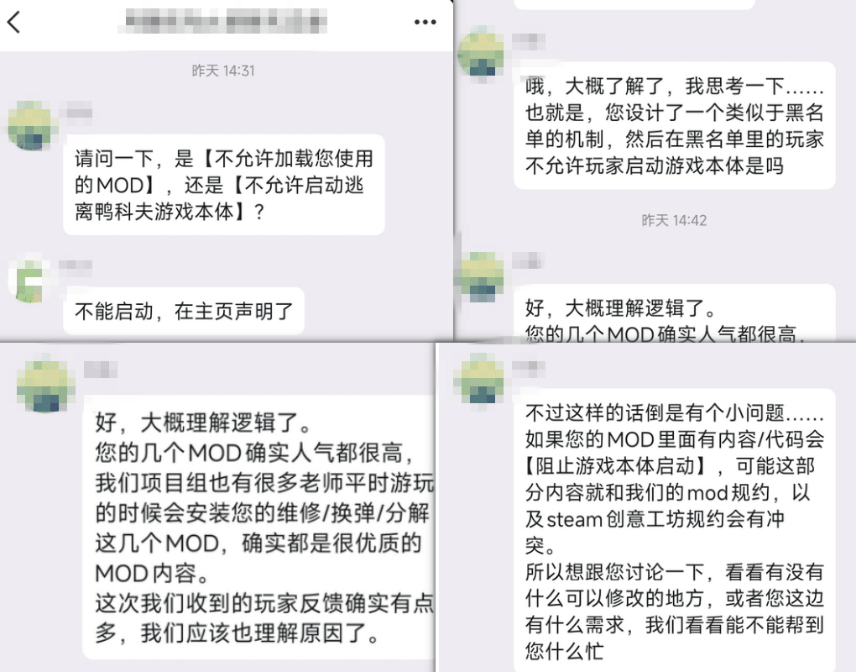 核心导火索在于官方与MOD作者的聊天记录流出:官方整体的态度放得比较低,措辞小心客气。