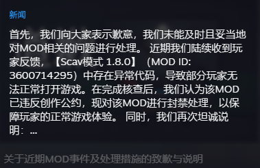 面对蜂拥而来的差评,官方终于发布正式道歉声明,表示已经封禁相应MOD,承认之前“相对缓和”的处理方式在原则上严重错误,并对玩家群体和遵循规矩的MOD开发者进行道歉。