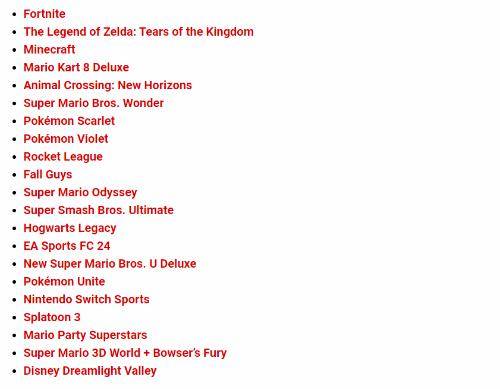除以上游戏外,其他持续受欢迎的游戏还包括《超级马里奥惊奇》、《宝可梦朱》、《宝可梦紫》、《火箭联盟》、《糖豆人》、《超级马里奥奥德赛》、《任天堂明星大乱斗特别版》、《霍格沃兹之遗》和《EA Sports FC 24》。
