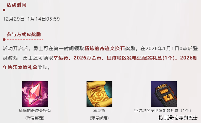 手游巴士(www.shouyoubus.com)2025年12月22日: 不知不觉间已经来到了25年的末尾,同时呢也迎来了26年的第一批活动,包括跨年签到和新的白金天3也都将如约而至,那么这里就来提前看看详细介绍!【1】跨年签到活动!该活动将于12.29更新后上线,可以领取精炼的奇迹变换石。然后重点内容放在了26年1.1号,只要上线就可以领取幸运符、2026万金币、深渊票、以及表情礼盒等道具。