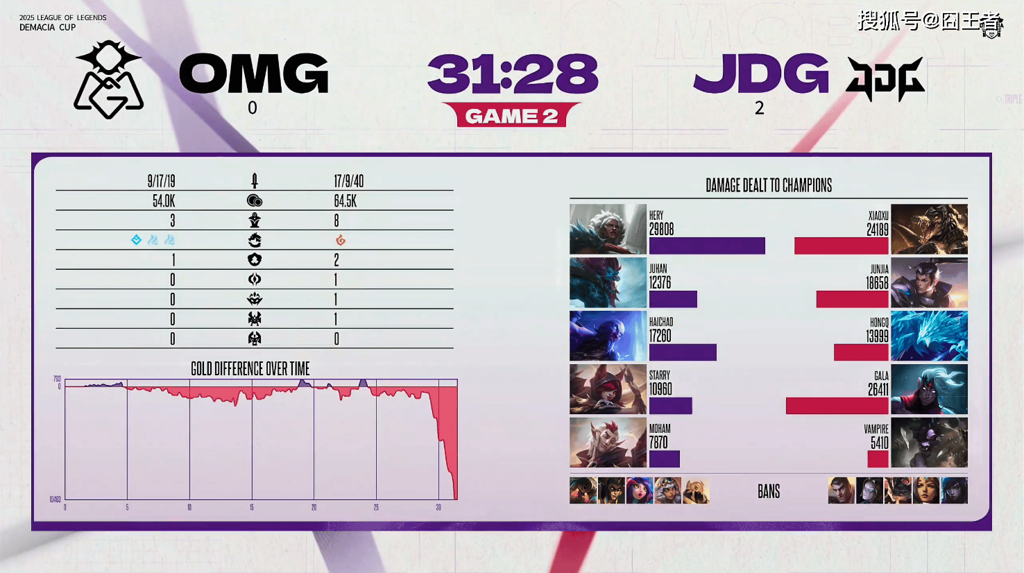 第一局比赛,OMG蓝色方,禁用:沙皇;奇亚娜;妮蔻;瑞兹;布隆,选用:Hery纳尔;Juhan蔚;haichao岩雀;Starry女枪;Moham波比;JDG红色方,禁用:杰斯;兰博;发条;石头人;赵信,选用:Xiaoxu亚恒;JunJia猴子;HongQ阿萝拉;GALA芸阿娜;Vampire蕾欧娜