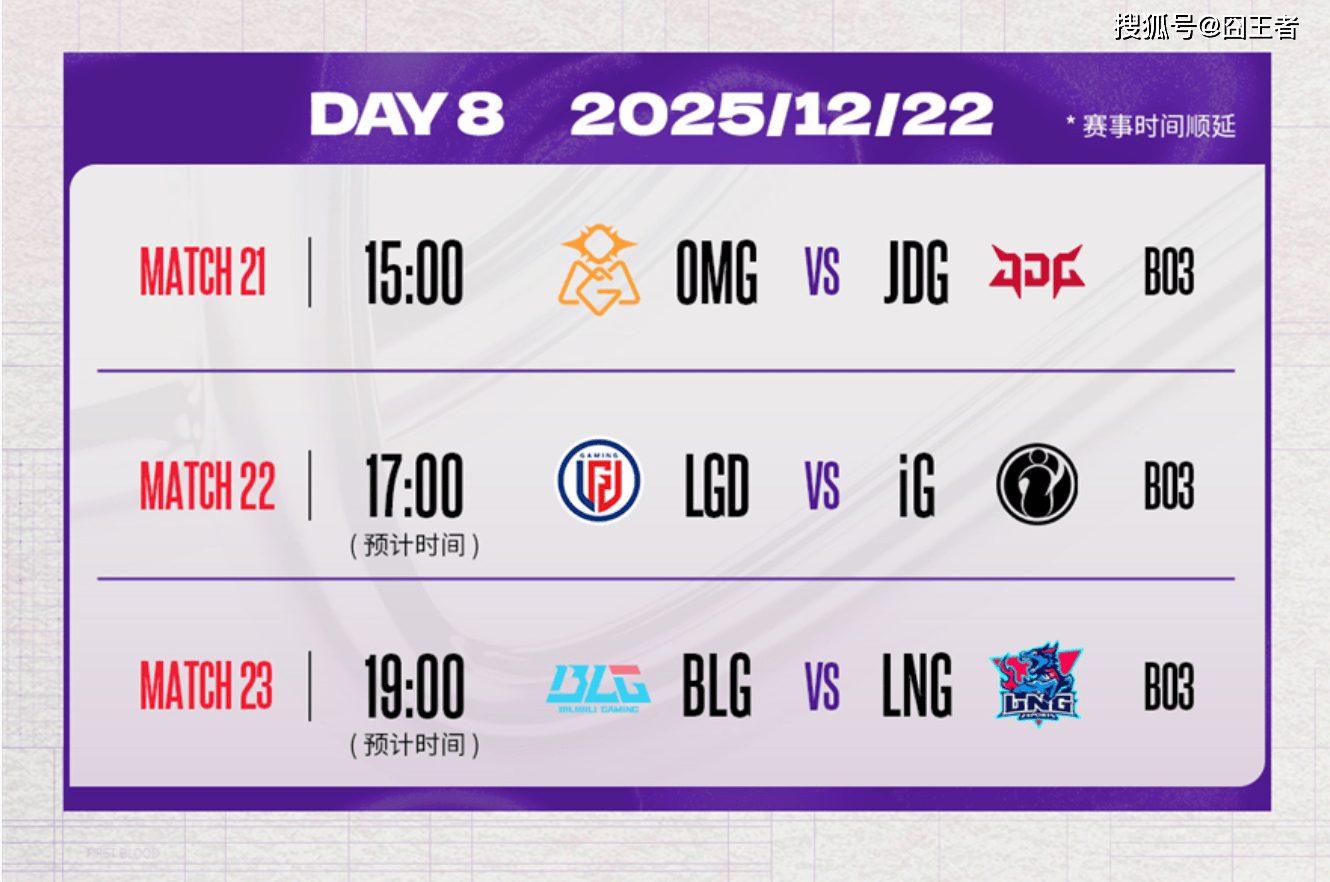 12月22日,三场比赛由OMG对阵JDG,LGD对阵IG,以及重头戏BLG大战LNG带来。谁又会笑到最后呢,让我们拭目以待。