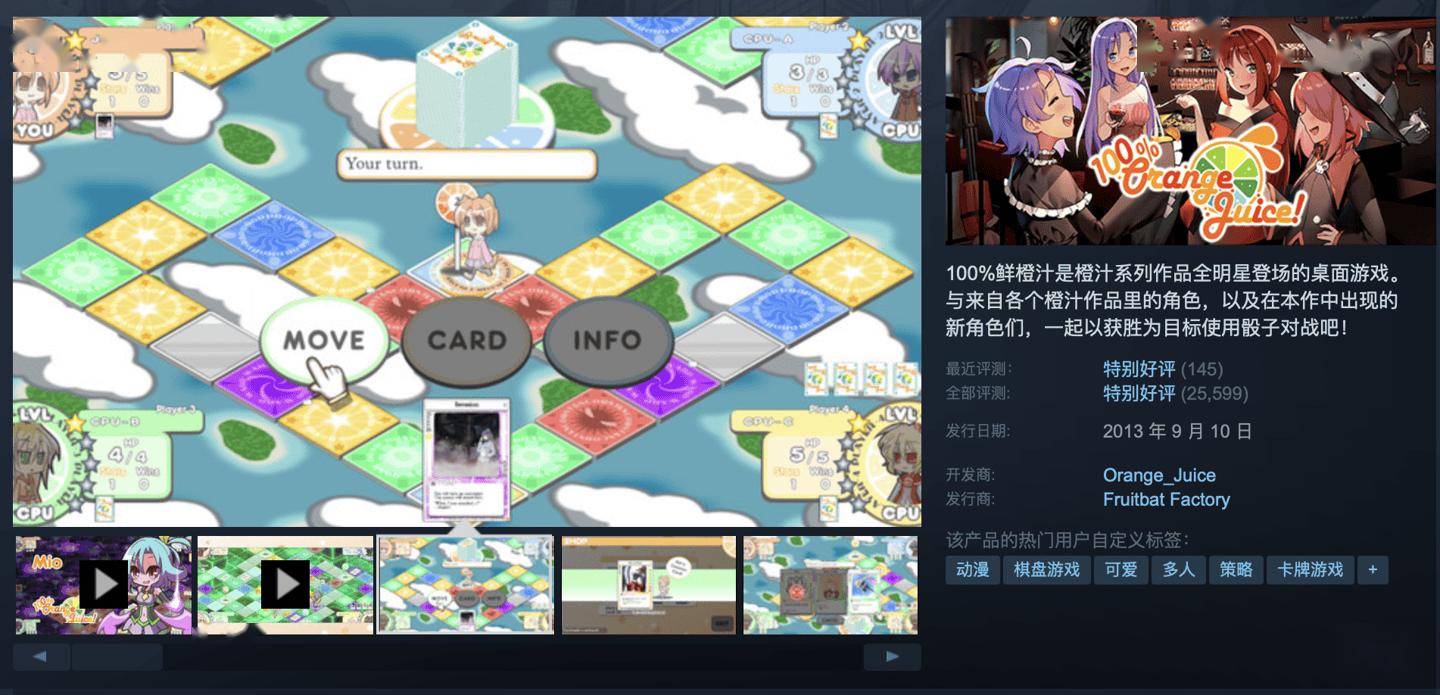 据介绍,这款游戏发布于 2013 年 9 月,Steam 国区原始售价为 29 元,游戏好评率为 92%“特别好评”。玩家可以在游戏中“与来自各个橙汁作品里的角色,以及在本作中出现的新角色们,一起以获胜为目标使用骰子对战”。
