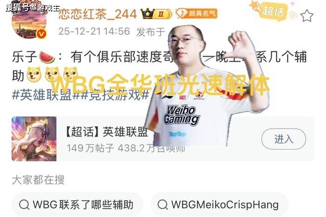 大家好,S15赛季的比赛已经全部结束了,相信绝大多数的玩家都关注了最近一段时间的对抗,Lpl赛区的德玛西亚杯进行的是比较激烈的。wbg战队作为转会期的顶级全华班阵容,粉丝们对于他们的这套配比还是非常关注的,但是在输给了OMG战队之后,一个大瓜也是被直接曝光出来。业内人士公开表示一支队伍在深夜快速操作,联系了多名辅助选手。综合所有的消息,应该就是wbg战队了,毕竟辅助二哈的操作确实有一些问题。难道说刘青松,hang或者meiko要重回职业舞台了吗?