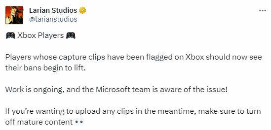 “在Xbox上上传了录制片段的玩家现在应该可以看到自己已经解封了。修改工作正在进行中,微软团队已经意识到了这个问题!如果你想在彻底解决之前上传任何片段,请确保先关闭成人内容。”