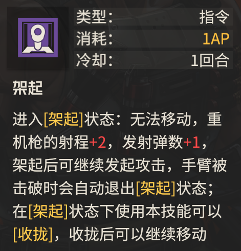 接着除了必带的【架起】之外,威廉的第一个玩法,“协力攻击”玩法还需同时带上【侧翼火力】+【枪火不断】两个协力辅助技能,并且因为带这两个技能外加【架起】的前提下,威廉自身消耗的AP数也是有限的,所以这也能帮助威廉更好的触发其专属机兵“金刚”的【蓄能增幅装置】增伤效果。