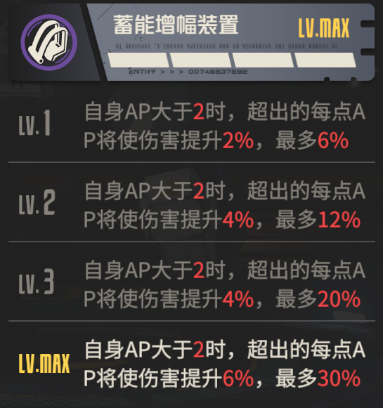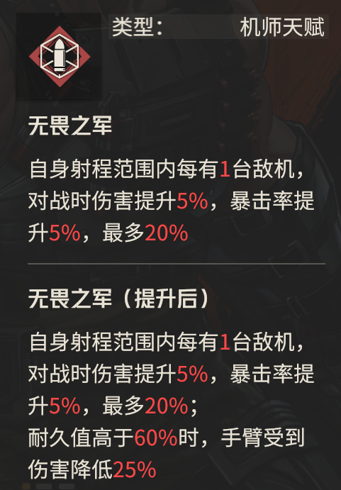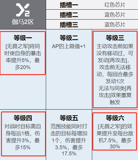 接着威廉的天赋【无畏之君】,会受到其“攻击范围”内的敌人数量来提升伤害,同时在伽马2区激活后还能顺道提升暴击率,伤害和暴击率的提升伤害都是20%(伽马2区16算力后增伤部分的上限会提升到30%),需要攻击范围内有4名敌人即可叠满,这个增伤的上限一般情况下还是很难实现的,但是当威廉【架起】后,5格的攻击范围就能为天赋提供更大的覆盖范围了,增伤效果也会有更好的保障。