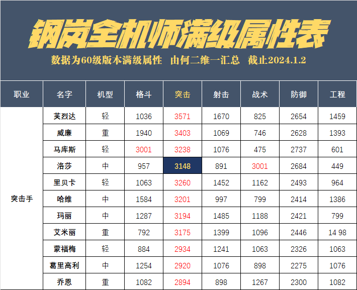 而今天咱们的主角,威廉的属性则是排名全突击的第2,不过说实话他和芙烈达的属性差距还是有点打的,如果我们用威廉的突击属性3403作为基础,芙烈达就要高出威廉5%之多,这个幅度已经是钢岚里相当大的一个差距了,大家参考下即可,哦对了这里特别提一句,芙烈达的突击属性要比洛莎高出13.5%......