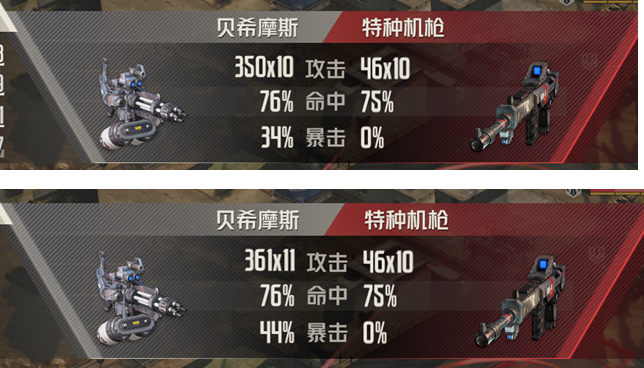 例如以本身弹数为10的重机枪“贝希摩斯”为例,在架起后弹数即会变为11,理论增伤幅度就是10%左右,效果还是不错的,和增伤背包都有些类似了,这点大家从上述的对比图中即可看到,另外特别吐槽一句,普通金刚和威廉的命中真的有点不够看......(例如上图中55级威廉对46级的普通小兵,居然只有76%的命中率)
