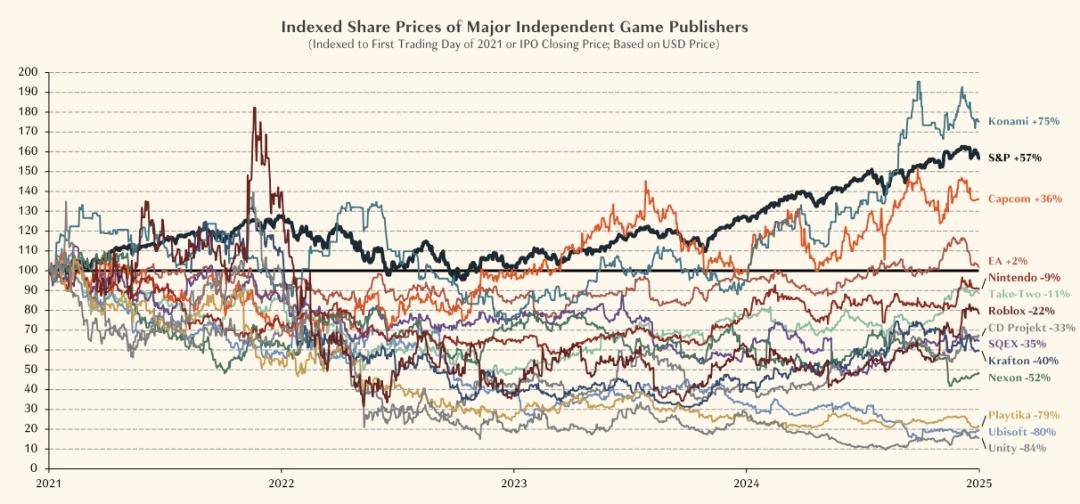统计至2025年初,行业整体拿到的“创业投资”连续四年下滑。大厂的股市表现证明了这点,相比2021年他们的股价是跌多涨少,跑过“标普500”的仅有Konami这一家。换句话说,就是投资游戏不赚钱,投资者正在失去信心。