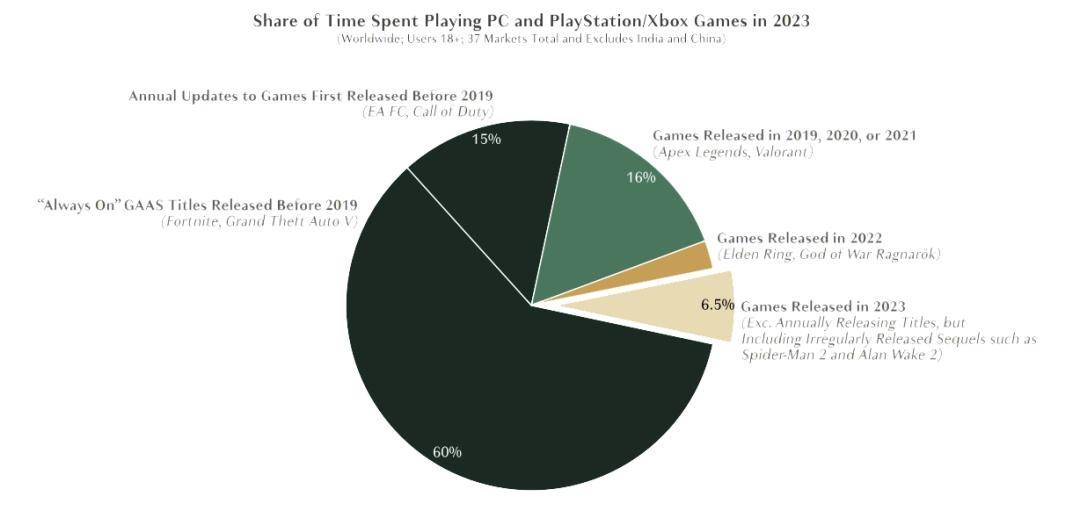 数据能佐证上述假设,2023的主机平台和Steam平台所有玩家的总游戏时间,60%花费在四年前的在线服务游戏,16%被花费在3年内的在线服务游戏,15%花费在年货游戏,只有6.5%的时间,被用来玩2023年的新游戏。