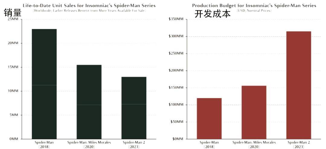 但冤枉吗?也真不冤。像《龙腾世纪:影障守护者》《哥谭骑士》这些亏麻了的3A项目就不多点名了。且拿商业和口碑都很成功的“漫威蜘蛛侠”系列举例,它三代游戏的开发成本翻了两倍还要多,销量却是每代都在下滑,这种表现就很有代表性。