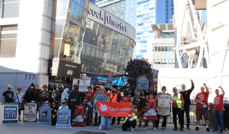 比起TGA的现场喧嚣,当时“孔雀剧院外”的活动更加热闹。仅一墙之隔,“电子游戏工会”组织着被裁员工的抗议,他们拿着纸质“墓碑”,上面是工作室的生卒年月;他们举起前任老板的肖像,上面画的是“悬赏通缉令”。