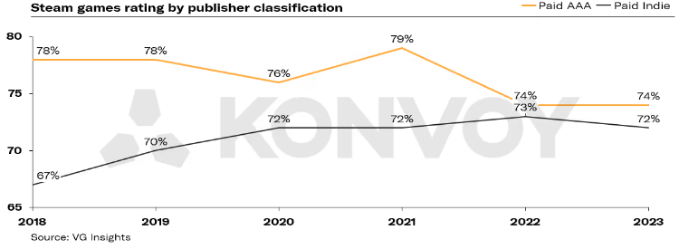 那么,也就可以理解为什么包括TGA和其他媒体,都在有意忽视3A,而主推“独立游戏”。一方面,独立游戏确实争气——早在2023年,Steam的平均好评率就已能和3A游戏的平均好评率,分庭抗礼;另一方面,独立游戏也是一种解决方案,解决了开发成本问题,解决了游戏太贵的问题,也解决了创新问题和投资风险问题。