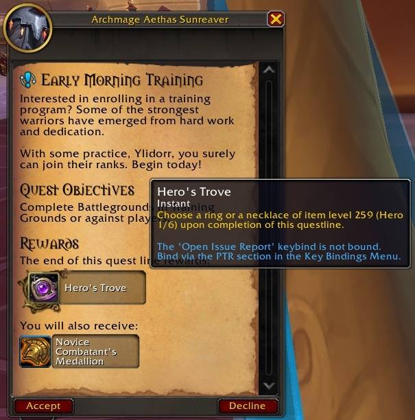 《魔兽世界》“至暗之夜”PTR加入全新的PvP训练场任务,奖励一件259装等的英雄级戒指或项链。
