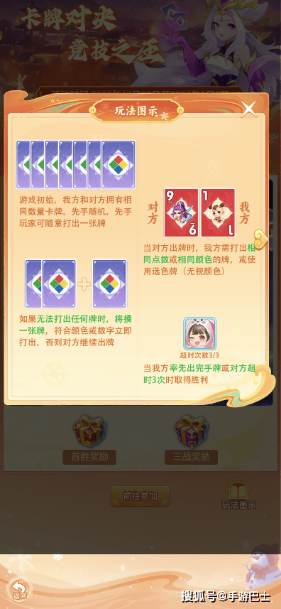 这是一场脑力的对决。活动期间内,少侠可在每日17时至21时找到长安城的牌王,参与匹配。每日对局首次胜利可领取首胜奖励,每日完成三次对局可获得三战奖励。短时间内不会匹配到相同的玩家,还请少侠注意。