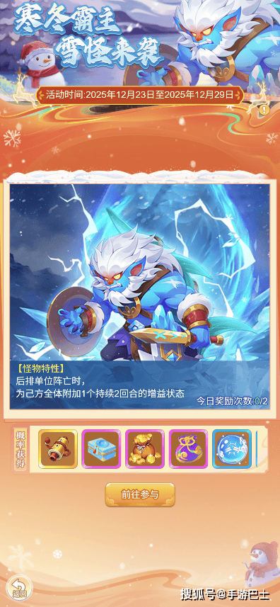 北风来临,大地开始带上了白色的点缀,雪怪也趁机入侵了各个主城。少侠快快拉起队伍,打败他们吧。活动期间内,雪怪每天会随机入侵一个地图,玩家需组成至少3人以上的队伍参与战斗。挑战时请注意查看每日雪怪的特性,不小心应对可是会吃大苦头的。