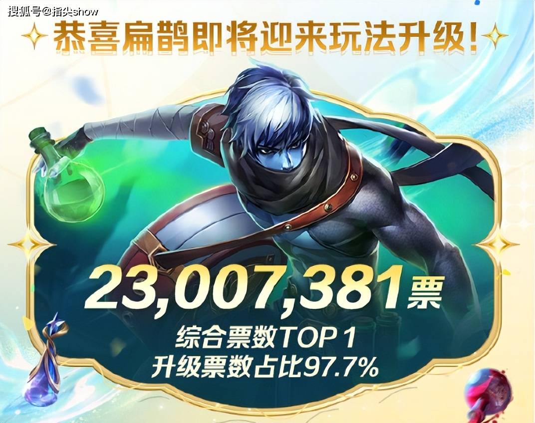综合票数排名第一,超过了2300万票,而97.7%的玩家都是投的升级票,所以扁鹊的升级可以说毫无争议,只需要等着就好。