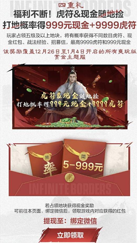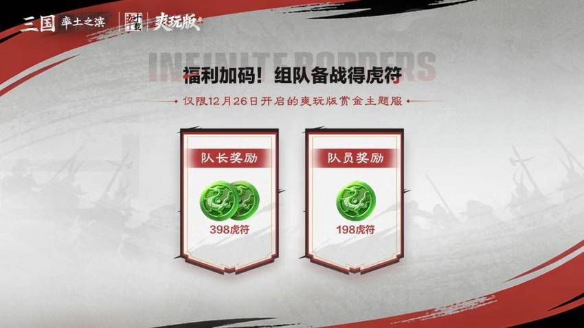 为了能让大家相信自己的诚意,《率土之滨》在爽玩服公测前,就拿出了百万现金给玩家白嫖。这些现金的获取方式近乎0门槛,比如你在开服之前前往指定活动页面参与或创建备战队伍,就能12月25日进入锁定期后分别获得398虎符和198虎符的奖励,根据队伍人数的不同,还能再共同瓜分最高3000元的现金。